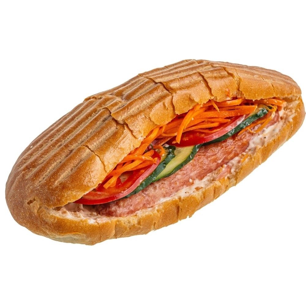 Булочка, морковка по корейский, огурец, помидор, соус чесночный, соус томатный, сосиска