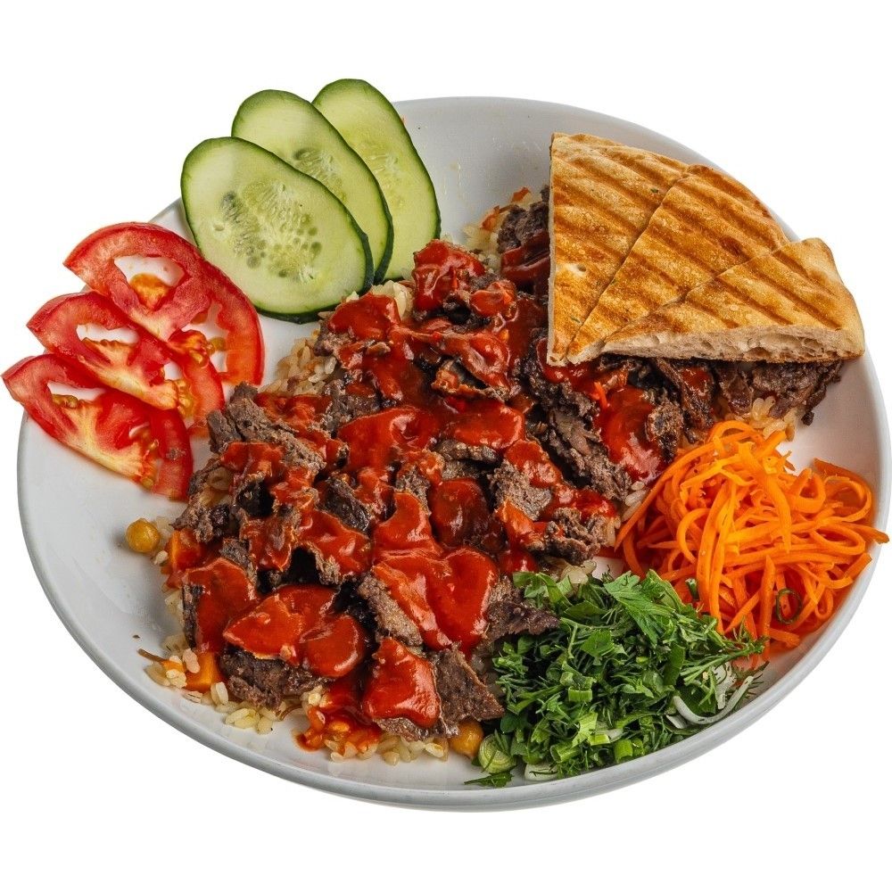 Мясо говядины, рис по-турецки, лепешка, корейская морковь, томатный соус, свежие помидоры и огурцы, зелень и лук.