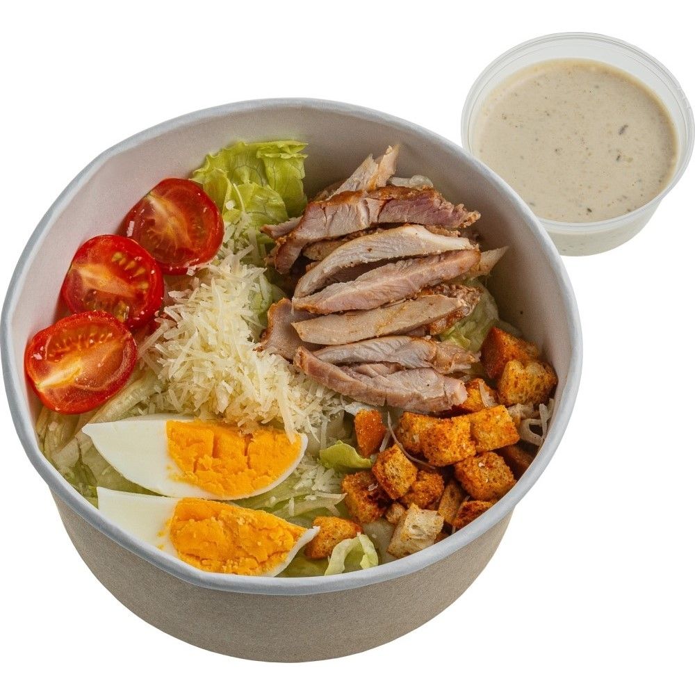 Салат айсберг, соус цезарь, яйцо куриное, помидоры черри, сыр Гоя, сухарики, курица на гриле