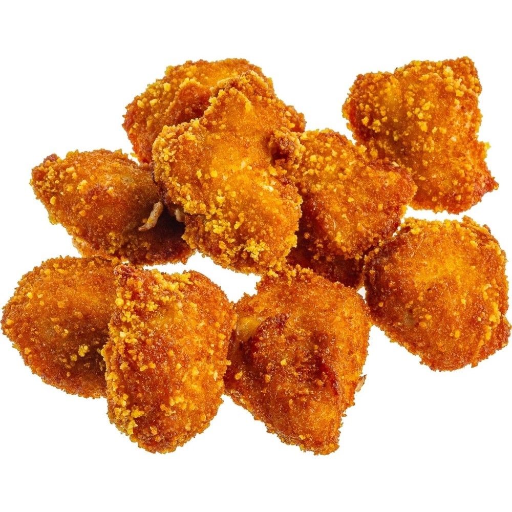 Кусочки куриного филе в хрустящей панировке, обжаренные во фритюре. С сырным соусом и луковыми чипсами