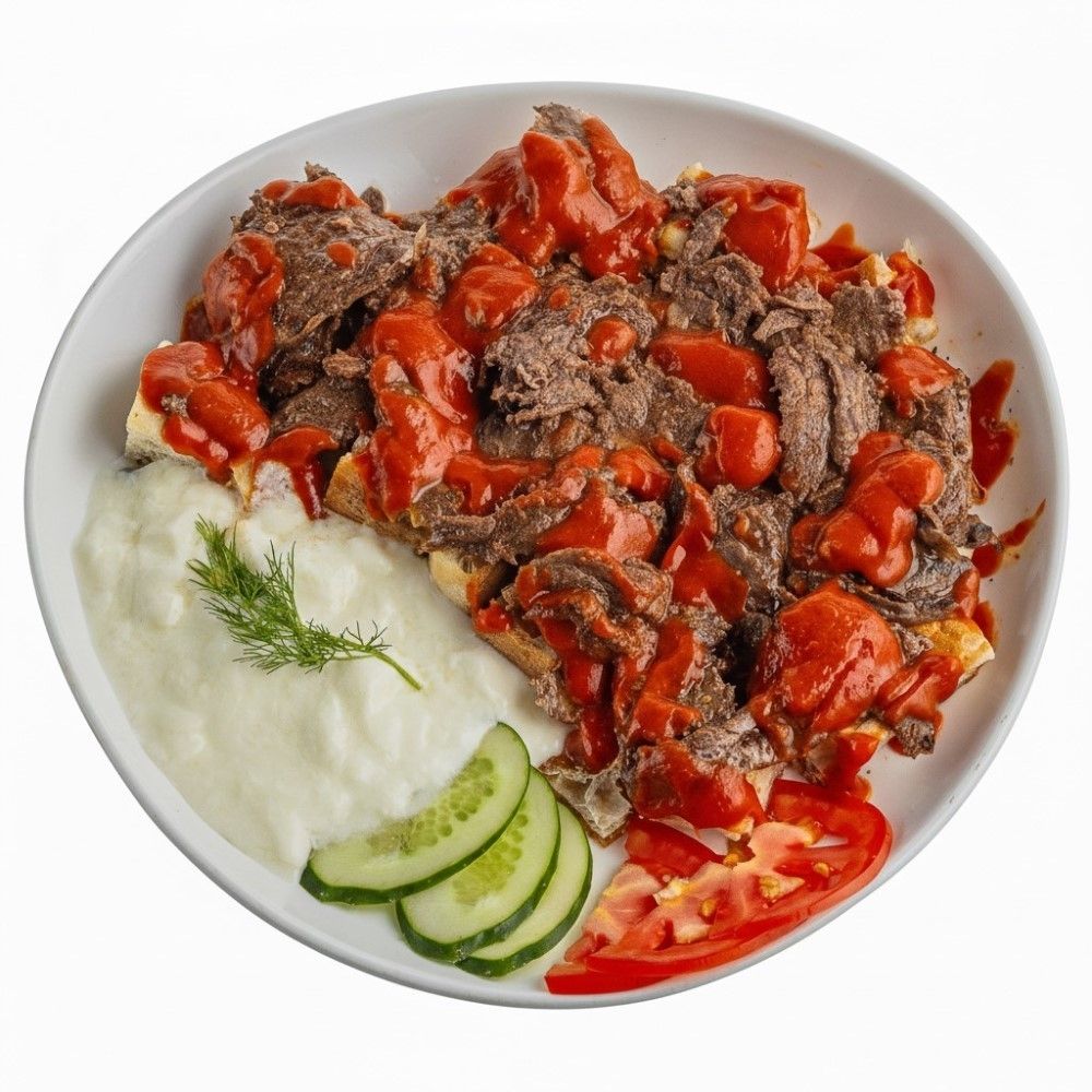 Мясо говядины, подушечки лепешки, турецкий йогурт, томатный соус, сливочное масло, свежие помидоры и огурцы.